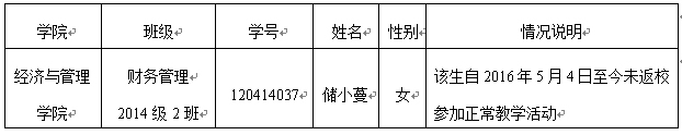 据《安庆师范学院学生违纪处分管理暂行规定》第十九条:“未经批准,离校连续14天以上的,按学生学籍管理规定,可作自动退学处理。”现公告催促储小蔓同学于2016年6月22日之前返校办理手续,逾期按自动退学处理。