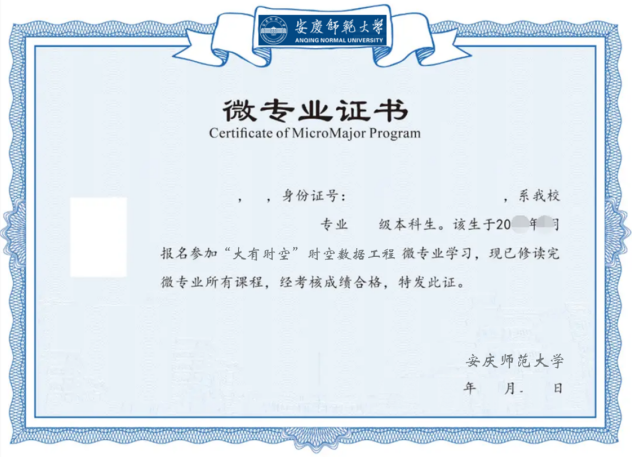 学生在毕业前,修满本培养方案规定的11个学分,由教务处统一发放“大有时空”时空数据工程微专业证书;不在中国高等教育学生信息网(学信网)备注信息,不授予学位。完成考核,可获得地理信息安全保密培训合格证书。
