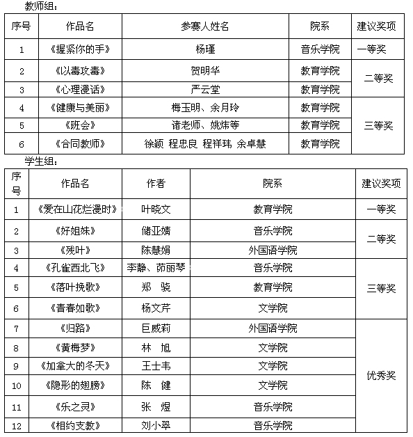 为了营造良好的校园文化氛围,展示beat365官网师生朝气蓬勃、奋发进取的精神风貌,充分发挥文化艺术活动的育人作用,丰富师生课余生活,展示师生艺术才华,提高艺术修养,建设和谐校园,校团委、学生处和教务处等单位联合举办了原创剧本写作大赛,beat365官网广大师生积极投稿,经过专家组评审,现将大赛评审结果予以公示:
