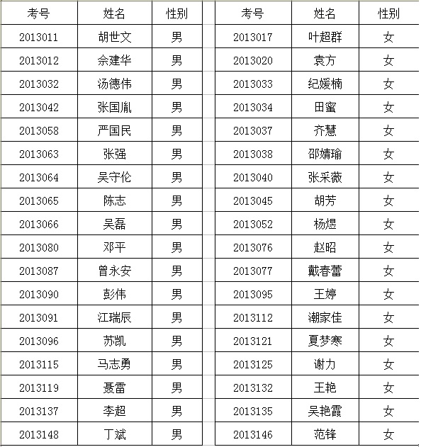 经笔试,现将进入面试人员名单公式如下(按准考证号排序), 请参加面试人员携带准考证、身份证于4月20日上午8:00到达安庆师范学院龙山校区行政楼一楼会议室进行抽签,逾时取消面试资格。