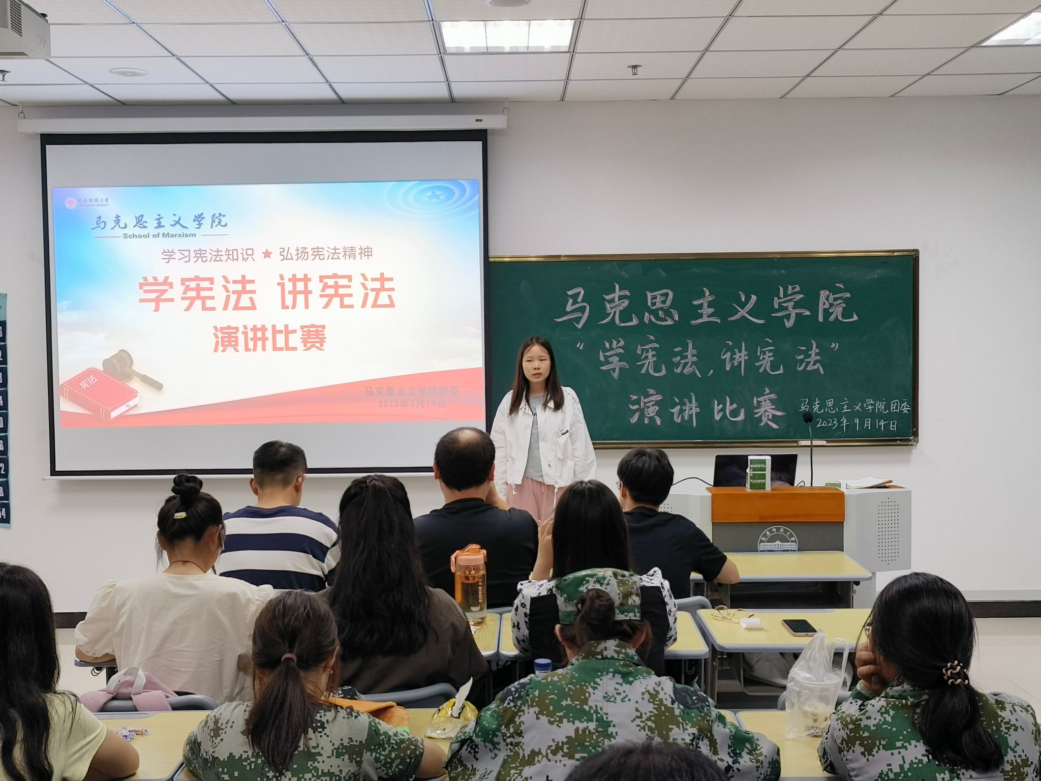 9月14日,马克思主义学院在Q305举办“学宪法,讲宪法”演讲比赛,共有8名选手参赛,近60名同学到场观摩。