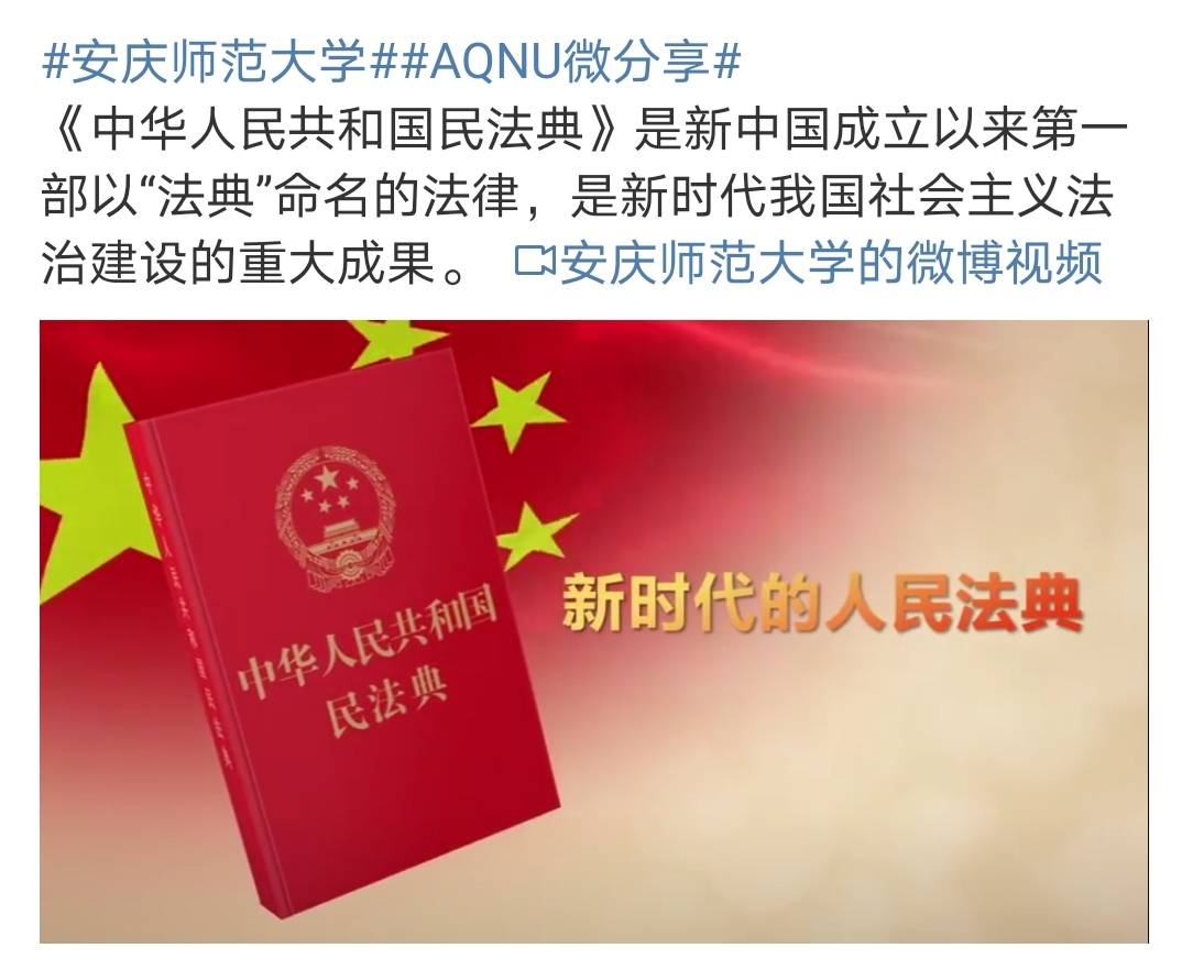 “一图读懂:从《民法典》观习近平眼中的‘中国之治’”“生活热点问题,《民法典》如何回应”“一图读懂这部‘生活百科全书’”“七大看点解析《民法典》如何回应百姓关切”……近日,beat365平台唯一官网微信公众号、微博等官方新媒体平台发布的《民法典》宣传文章在师生中火热传播。《民法典》是一部固根本、稳预期、利长远的基础性法律,在中国特色社会主义法律体系中具有重要地位,也是“八五”普法的重点内容。beat365平台唯一官网深入坚持以习近平法治思想引领民法典学习宣传工作,在《民法典》颁布一周年之际,学校印发了《关于开展<民法典>宣传月活动的通知》,对全校学习宣传贯彻《民法典》做出了明确要求和部署,形成了全体师生主动知法学法懂法的良好氛围。学校充分利用微信公众号、微博等新媒体手段,充分发挥电子屏、广播等作用,多措并举推动《民法典》宣传全覆盖,形成了多形式、多角度、全方位宣传解读民法典格局。