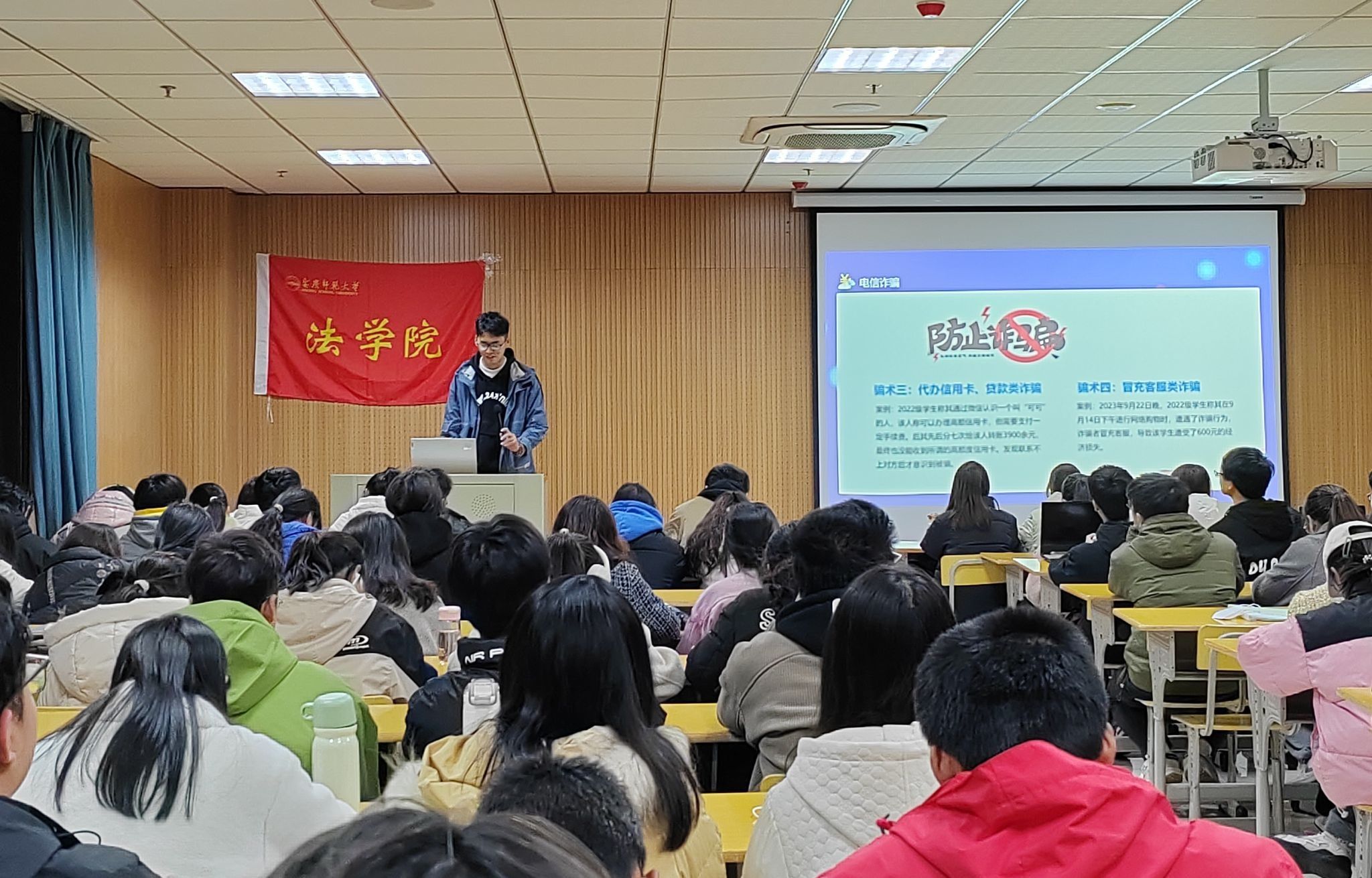 法学院学生会外联部部长陈磊担任主讲人。他分别从电信诈骗、贷款诈骗、网络诈骗、情感诈骗四个方面展开宣讲。他结合近年来频发的各类诈骗案件,剖析了犯罪分子的作案手法,引导同学们辨识骗局、熟悉套路。期间,他重点强调了刷单兼职、网络交友等大学生群体容易“中招”的诈骗形式,同时针对性地为同学们介绍了防范诈骗的有效方法以及“六个一律”“八个凡是”等防诈骗口诀。