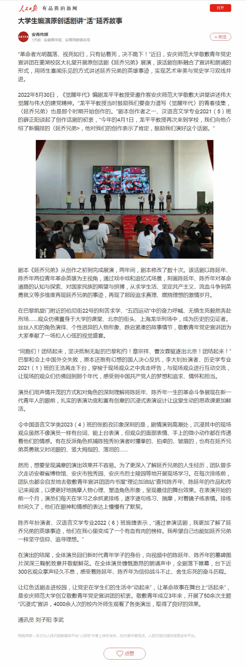 下一篇:中国青年报客户端:大学生编演话剧《延乔兄弟》, 让革命故事在舞台上“活起来”