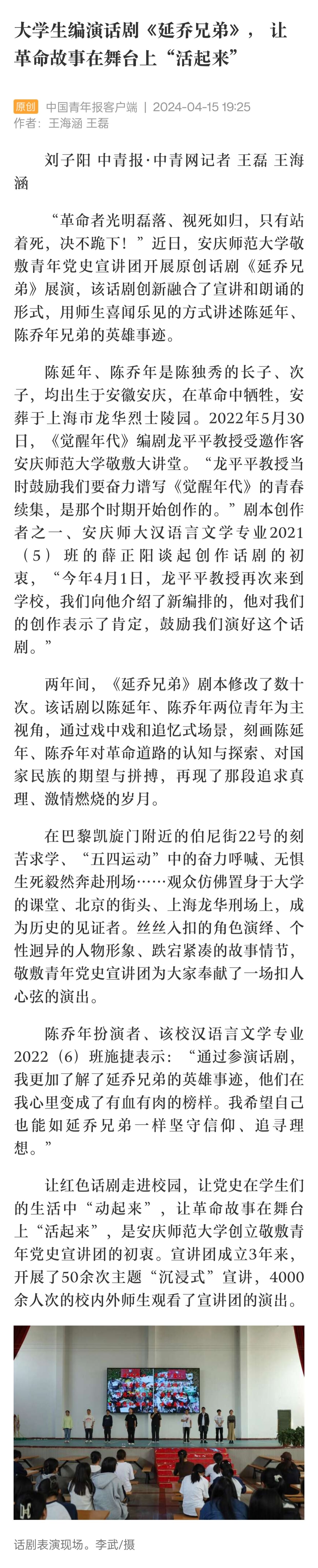 上一篇:人民日报:大学生编演原创话剧讲“活”延乔故事