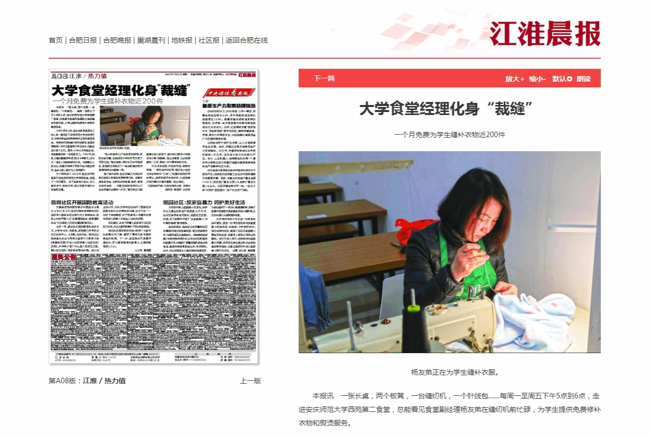 今年3月中上旬,杨友弟和食堂其他工作人员一起创办了beat365平台唯一官网衣物便利站,为学校学生提供免费修补衣物和熨烫服务。考虑到对衣物缝补技术的要求,食堂本想聘请一名专业裁缝来为学生服务,但杨友弟力荐了自己。原来,今年43岁的杨友弟,曾是裁缝店的一名资深员工。1999年,她到上海的裁缝店学徒,经过9年练习,成长为一名私人定制服装设计师。但随着女儿的出生,她最终选择了带孩子返回老家安庆,全身心投入到对女儿的照顾中。