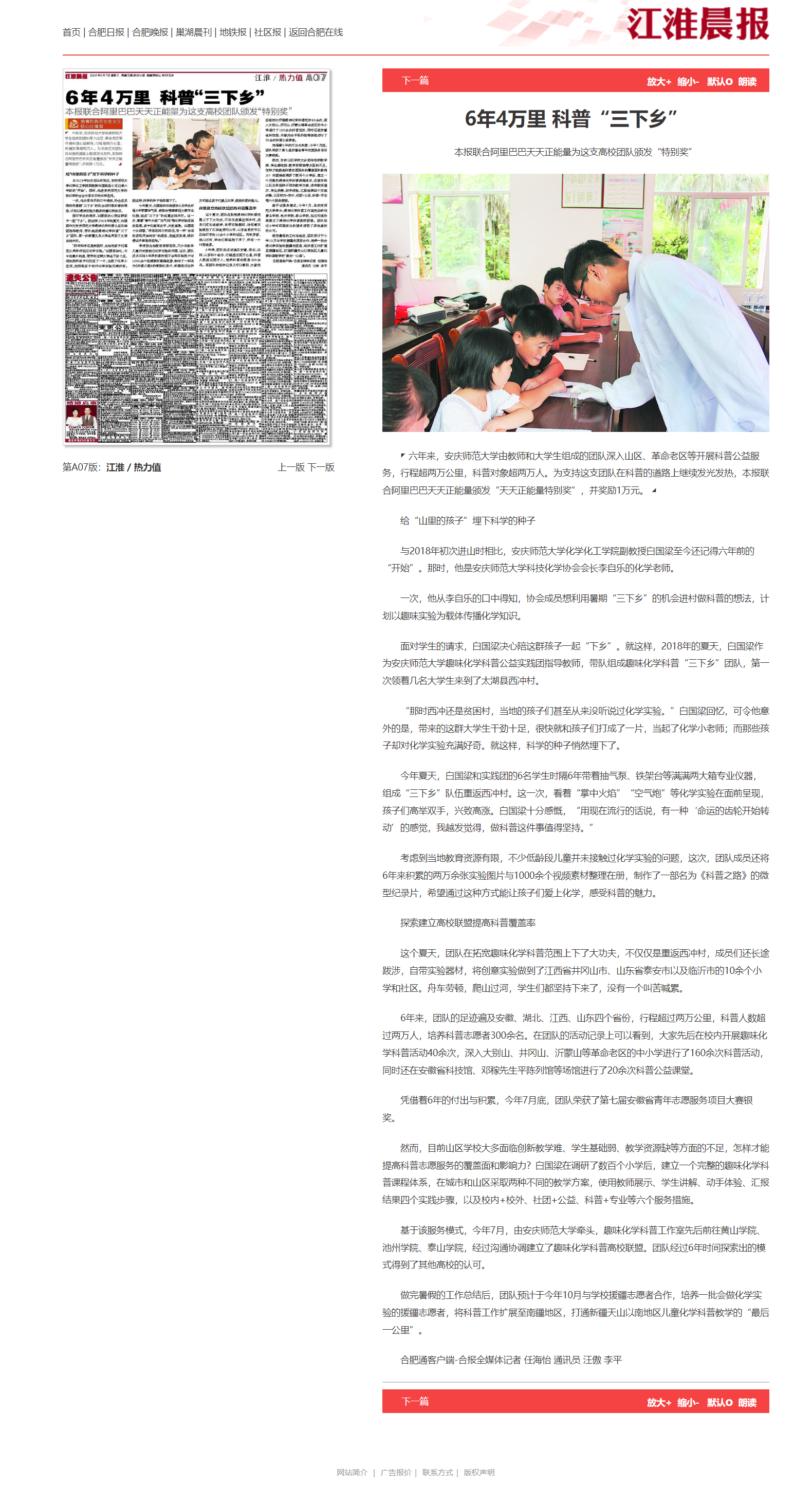 ◤ 六年来,beat365平台唯一官网由教师和大学生组成的团队深入山区、革命老区等开展科普公益服务,行程超两万公里,科普对象超两万人。为支持这支团队在科普的道路上继续发光发热,本报联合阿里巴巴天天正能量颁发“天天正能量特别奖”,并奖励1万元。 ◢