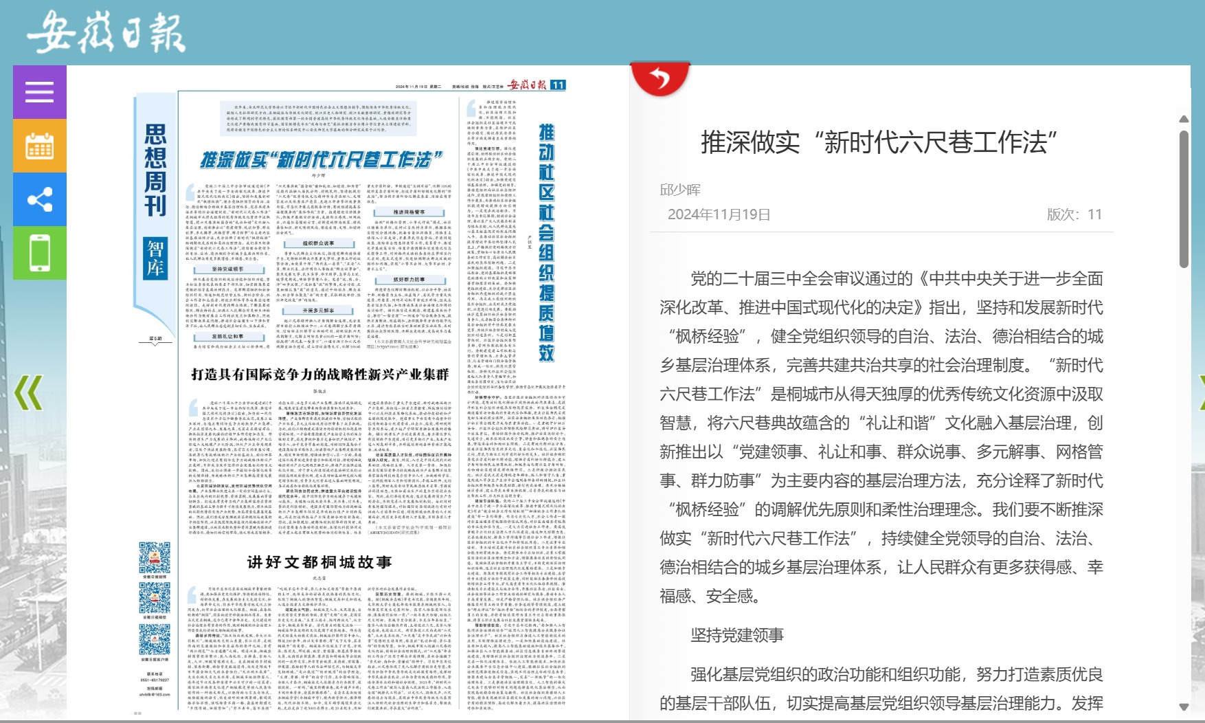 党的二十届三中全会审议通过的《中共中央关于进一步全面深化改革、推进中国式现代化的决定》指出,坚持和发展新时代“枫桥经验”,健全党组织领导的自治、法治、德治相结合的城乡基层治理体系,完善共建共治共享的社会治理制度。“新时代六尺巷工作法”是桐城市从得天独厚的优秀传统文化资源中汲取智慧,将六尺巷典故蕴含的“礼让和谐”文化融入基层治理,创新推出以“党建领事、礼让和事、群众说事、多元解事、网格管事、群力防事”为主要内容的基层治理方法,充分诠释了新时代“枫桥经验”的调解优先原则和柔性治理理念。我们要不断推深做实“新时代六尺巷工作法”,持续健全党领导的自治、法治、德治相结合的城乡基层治理体系,让人民群众有更多获得感、幸福感、安全感。