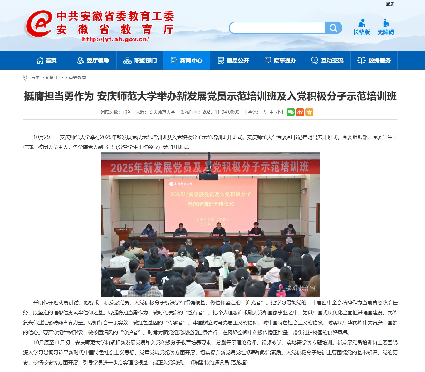 【安徽教育网】挺膺担当勇作为 beat365平台唯一官网举办新发展党员示范培训班及入党积极分子示范培训班https://jyt.ah.gov.cn/xwzx/gdjy/40771472.html