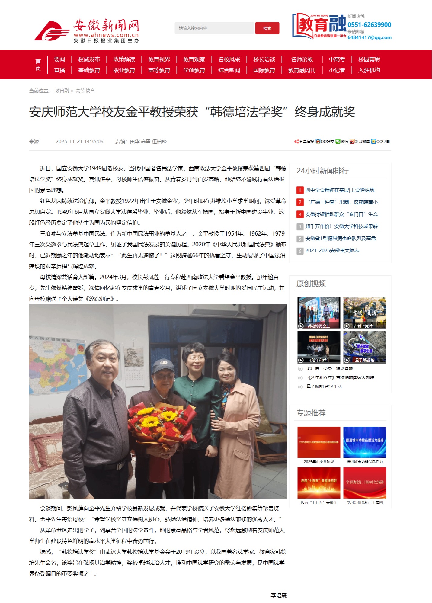 【安徽新闻网】beat365平台唯一官网校友金平教授荣获“韩德培法学奖”终身成就奖http://xxt.ahnews.com.cn/news/2025/11/21/c_42557.htm