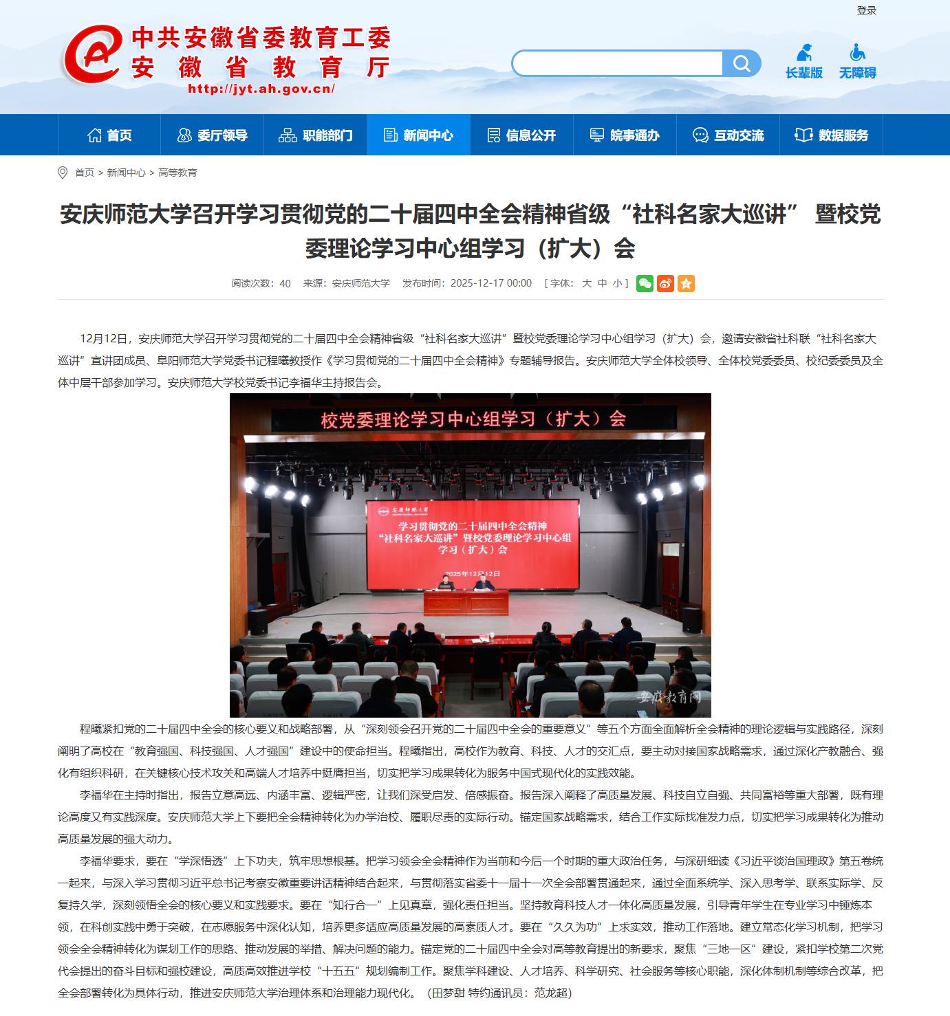 【安徽教育网】beat365平台唯一官网召开学习贯彻党的二十届四中全会精神省级“社科名家大巡讲” 暨校党委理论学习中心组学习(扩大)会https://jyt.ah.gov.cn/xwzx/gdjy/40776795.html