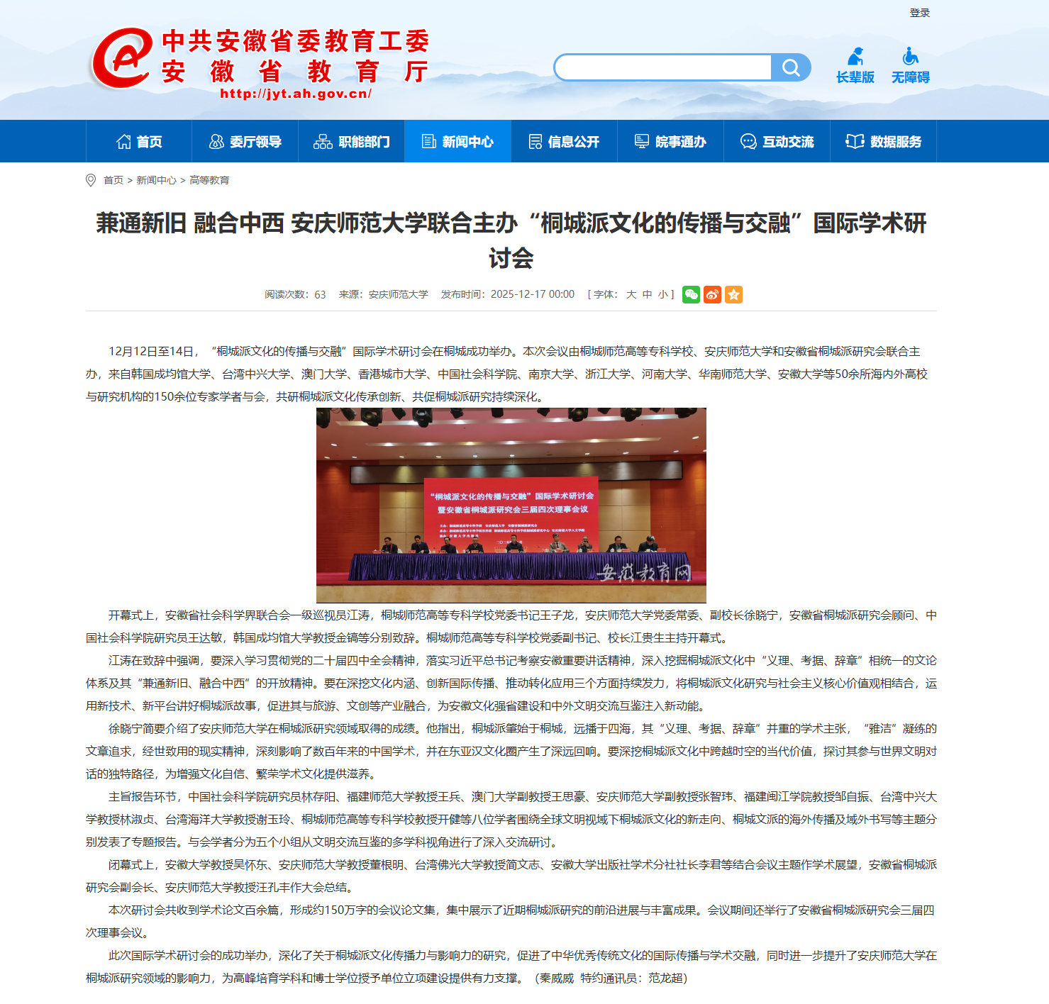 【安徽教育网】兼通新旧 融合中西 beat365平台唯一官网联合主办“桐城派文化的传播与交融”国际学术研讨会https://jyt.ah.gov.cn/xwzx/gdjy/40776776.html