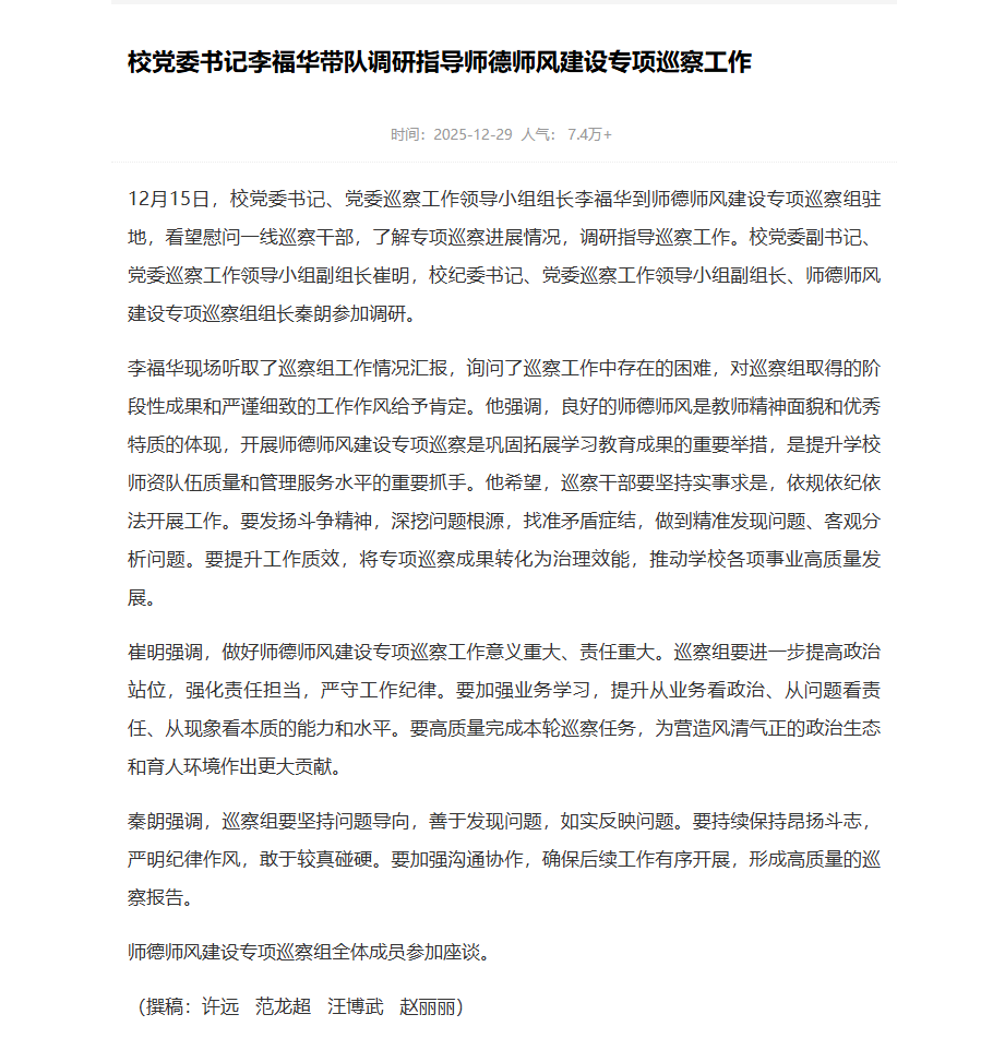 【党建头条】校党委书记李福华带队调研指导师德师风建设专项巡察工作https://www.djttw.com/m/view.php?aid=1046093