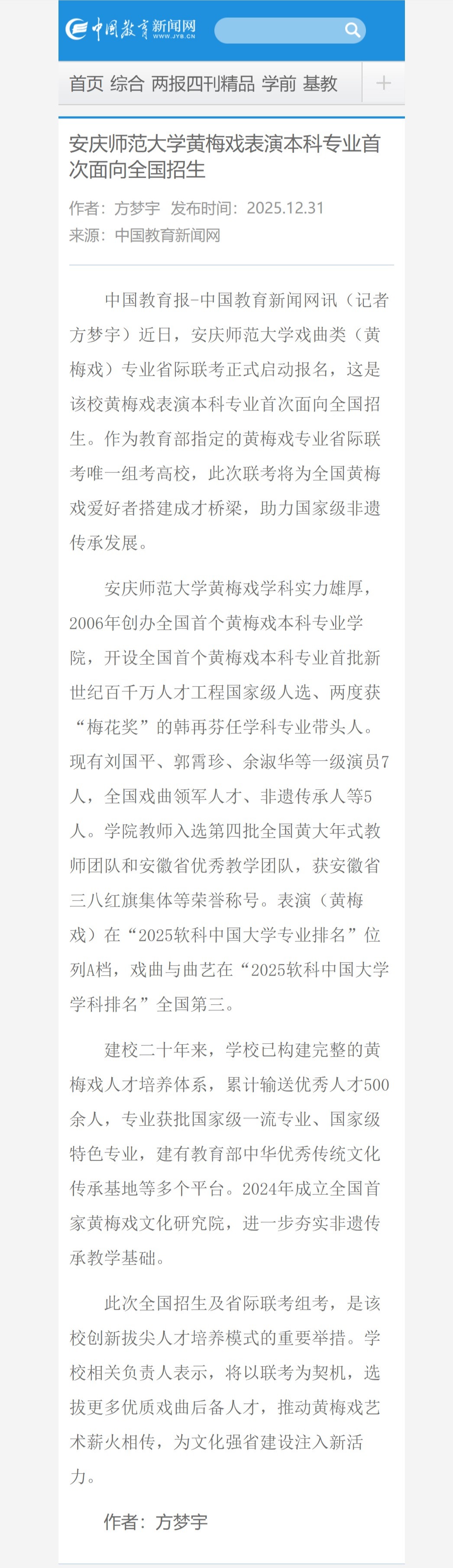 【中国教育新闻网】beat365平台唯一官网黄梅戏表演本科专业首次面向全国招生http://m.jyb.cn/rmtzcg/xwy/wzxw/202512/t20251231_2111432618_wap.html