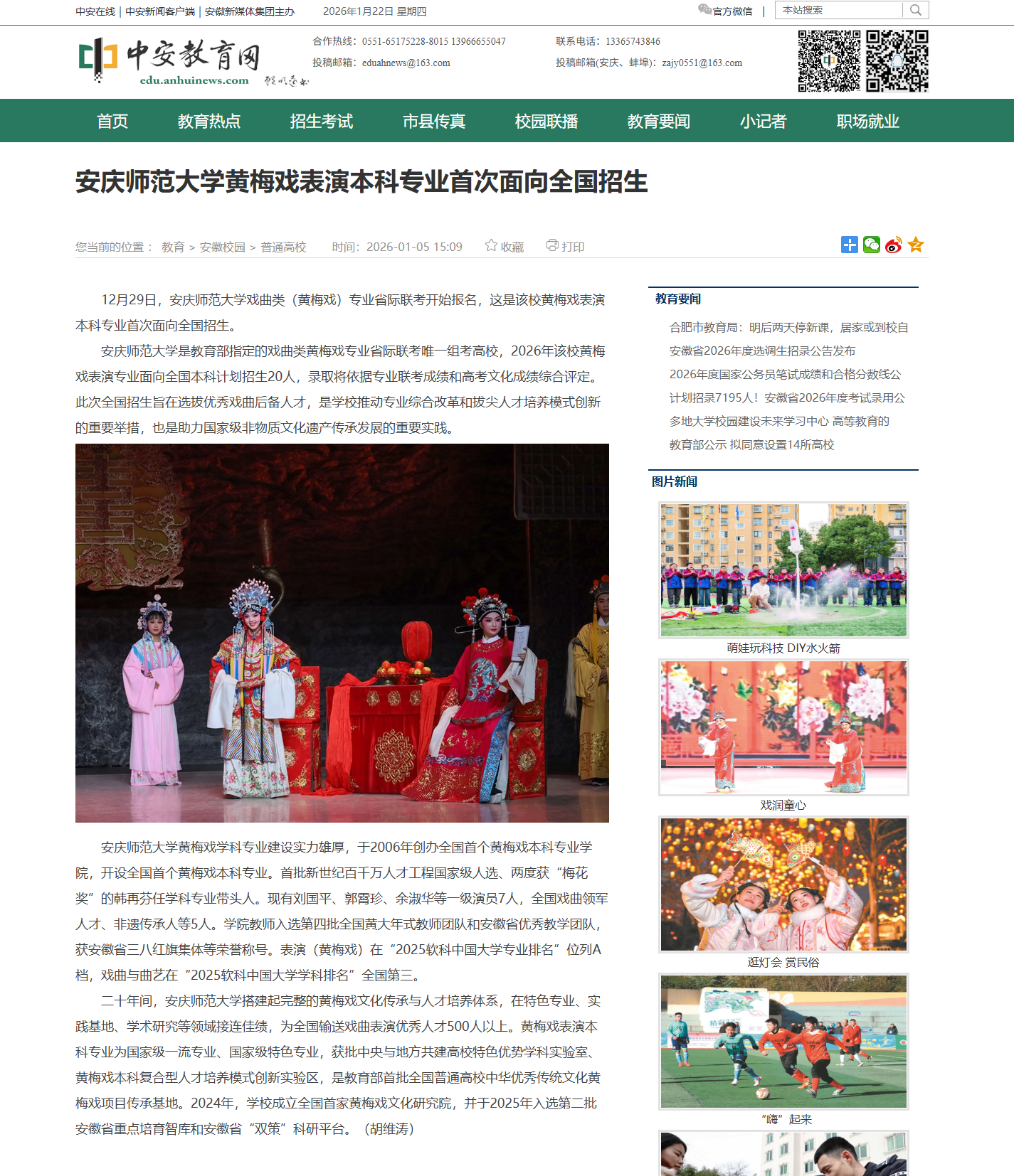 【中安教育网】beat365平台唯一官网黄梅戏表演本科专业首次面向全国招生http://edu.anhuinews.com/ahxy/ptgx/202601/t20260104_9014463.html