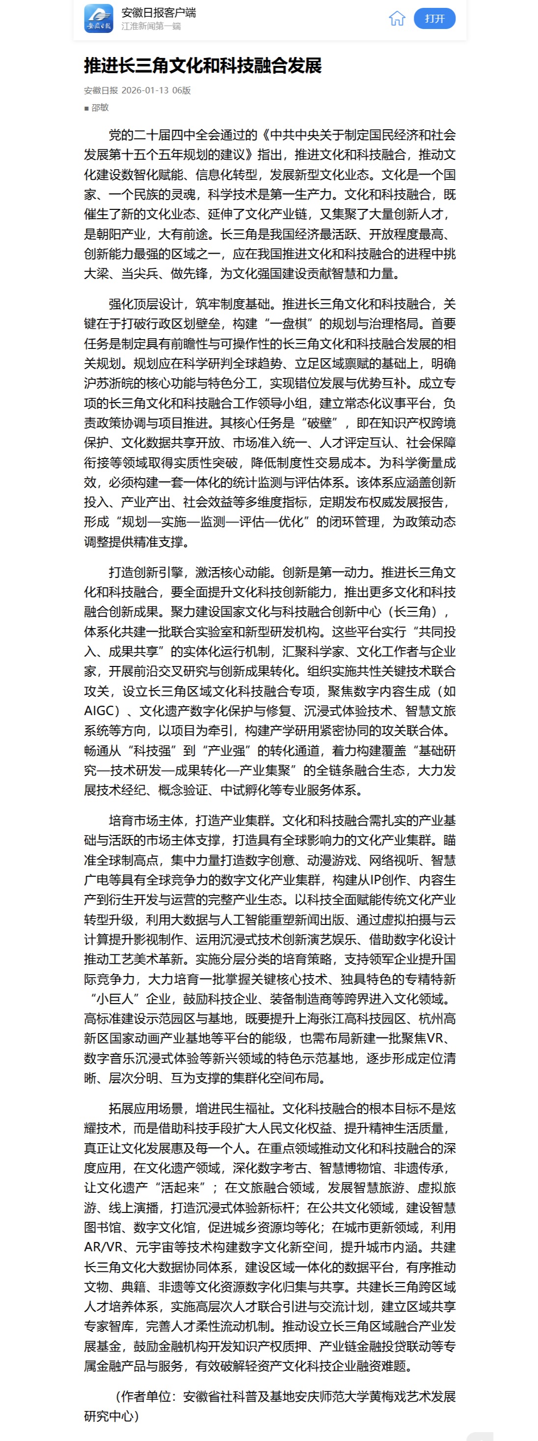 【安徽日报】推进长三角文化和科技融合发展https://app.ahnews.com.cn/displayTemplate/news/newsDetail/1121170.html?isDigital=true&isShare=true&xyt=1768262514340