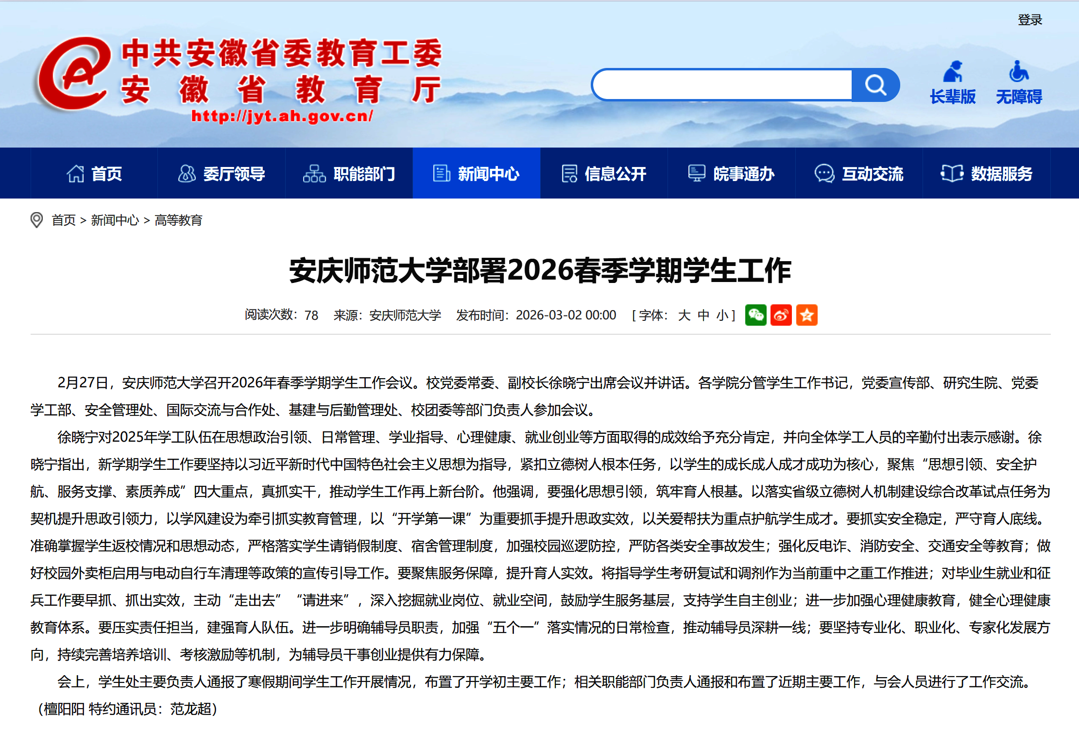 【安徽教育网】beat365平台唯一官网部署2026春季学期学生工作https://jyt.ah.gov.cn/xwzx/gdjy/40782658.html