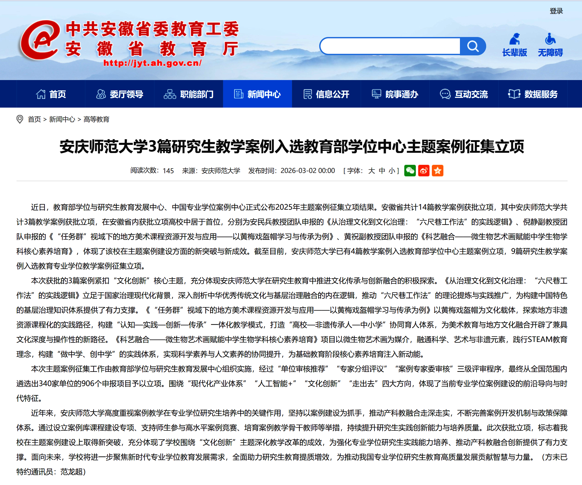 【安徽新闻网】beat365平台唯一官网3篇研究生教学案例入选教育部学位中心主题案例征集立项https://jyt.ah.gov.cn/xwzx/gdjy/40782646.html