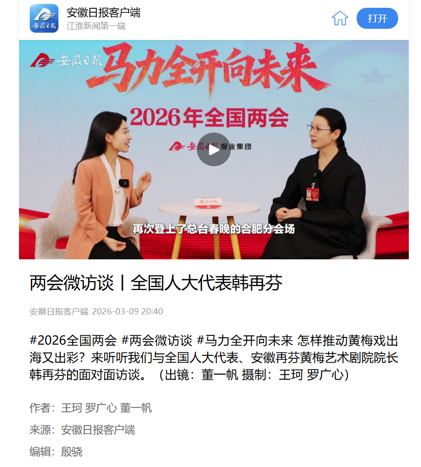 安徽日报:两会声音 | 全国人大代表韩再芬:努力坚守戏曲本源,让传统文化发光发热