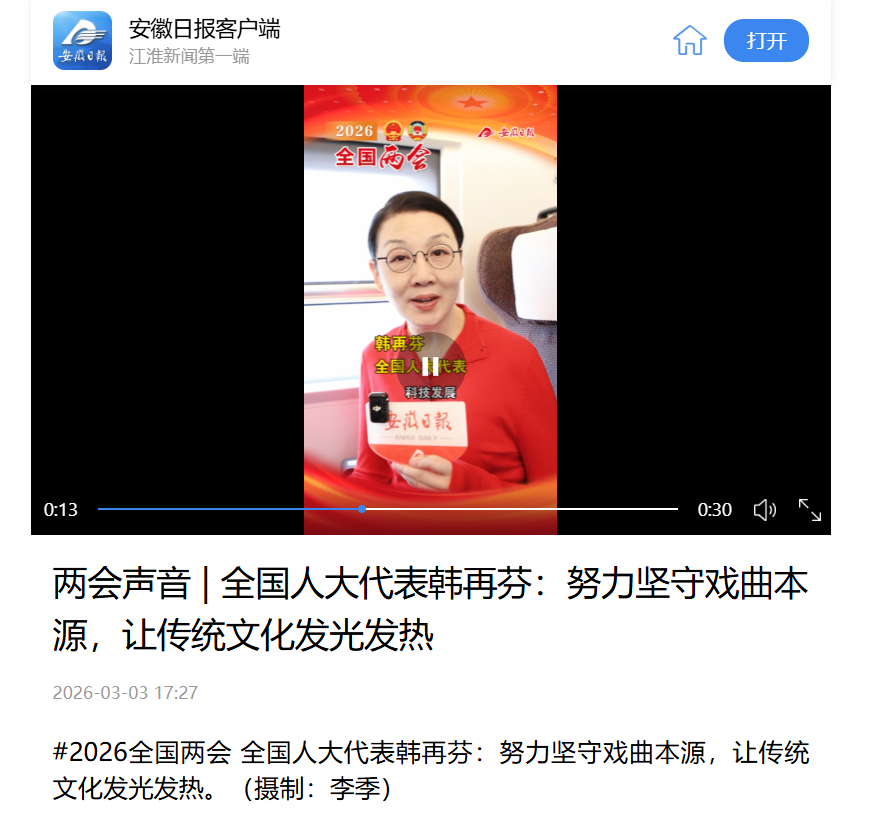 安徽日报:两会声音丨全国人大代表韩再芬:用黄梅戏的乡音讲好中国故事,传播中国的声音