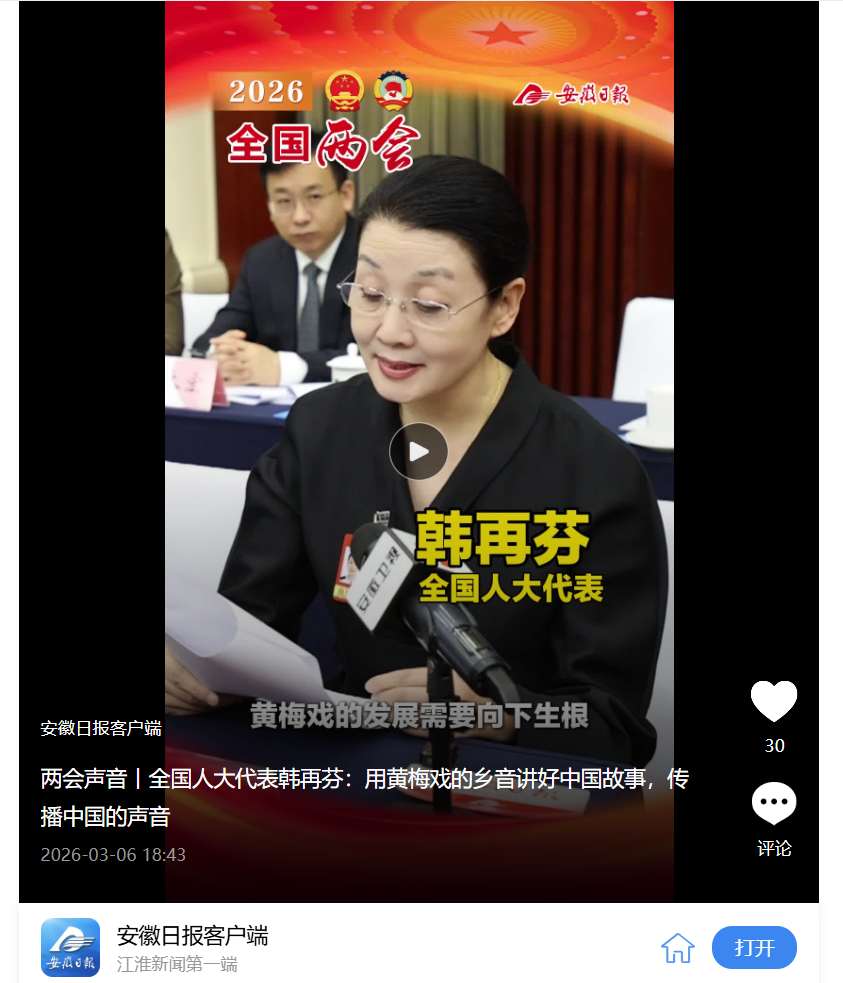 安徽日报:两会声音丨全国人大代表韩再芬:用黄梅戏的乡音讲好中国故事,传播中国的声音