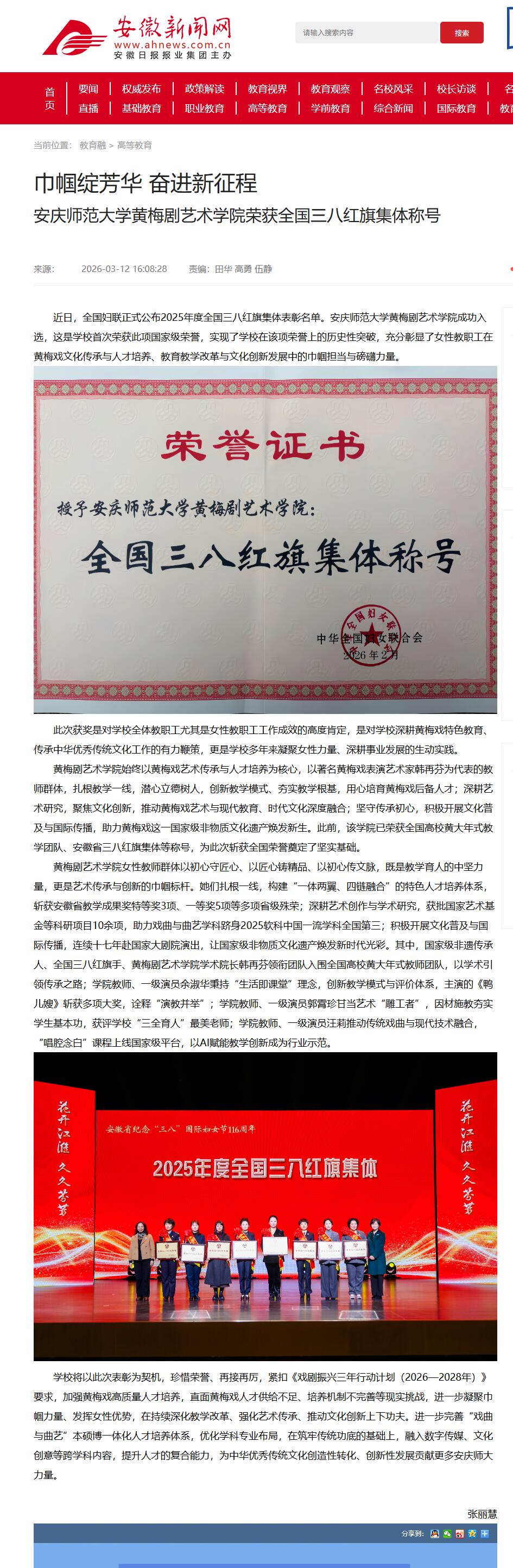 安徽新闻网:巾帼绽芳华 奋进新征程 beat365平台唯一官网黄梅剧艺术学院荣获全国三八红旗集体称号