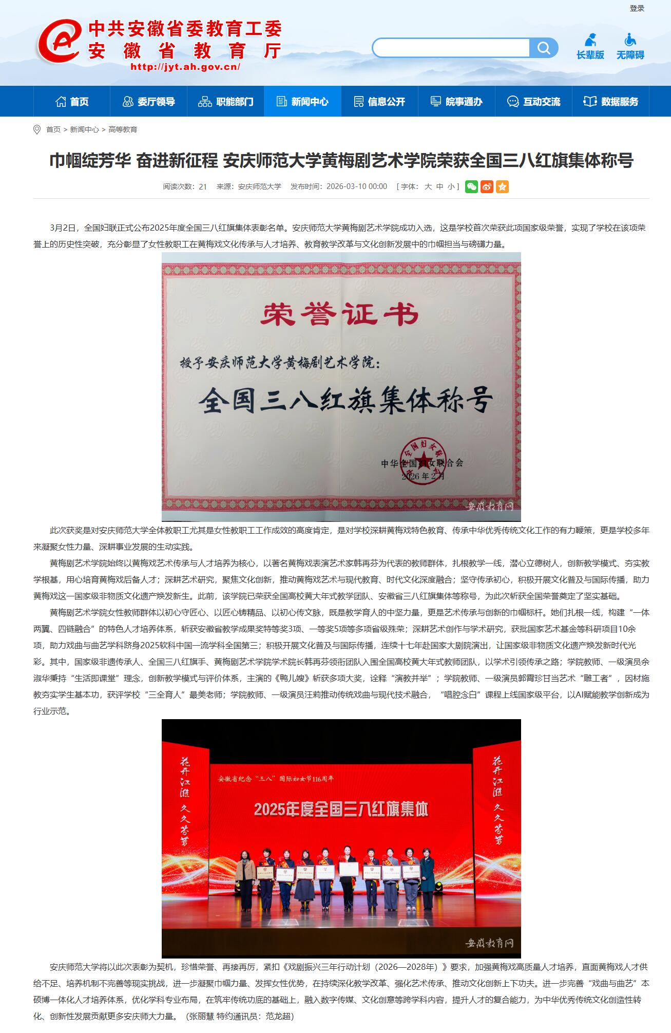 安徽新闻网:巾帼绽芳华 奋进新征程 beat365平台唯一官网黄梅剧艺术学院荣获全国三八红旗集体称号