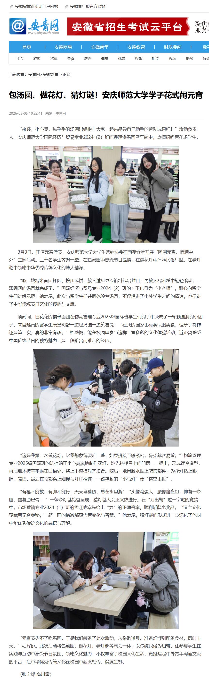 来源:【安青网】包汤圆、做花灯、猜灯谜!beat365平台唯一官网学子花式闹元宵https://www.ahyouth.com/news/20260305/1778214.shtml