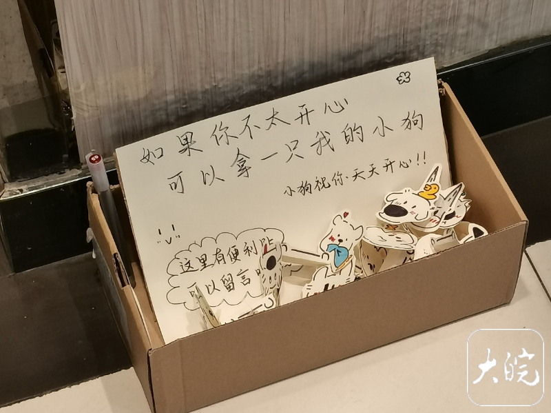 3月22日,记者采访了解到,这是该校美术学院4名学生筹划的“小狗送温暖”活动,她们在盒子内放置了各样手工立体小狗,并配上“如果你不开心,可以拿一只我的小狗”字样,为来往学生送上惊喜。