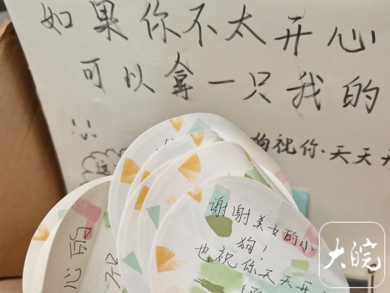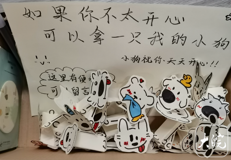除了送出温暖,毕唯依和室友们也收到了来自陌生人的祝福。“学业顺利”“要天天开心”“感谢你的小狗”……不少领到小狗的学生将自己的烦恼、祝福写在了便利贴上。活动策划人之一、美术学专业2021级(2)班的陶悦告诉记者,“生活中的小美好无处不在,希望能有更多人去发挥自己的力量让温暖传递。”