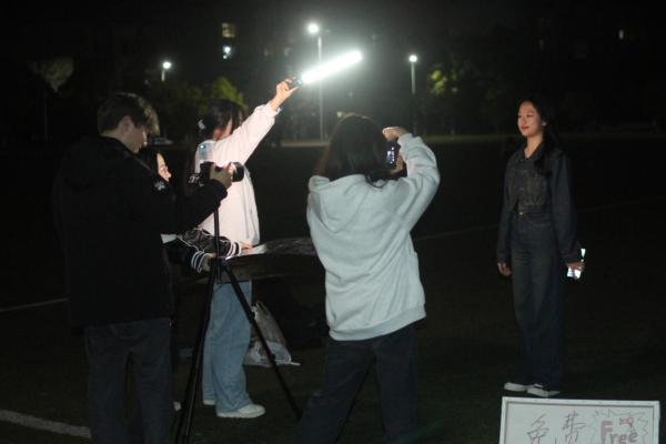 在抖音上看到其他高校学生发布“免费拍照”活动视频,激发了沈如瑾与团队成员的拍摄兴趣。安放玩偶与彩灯,自制“免费拍照”纸板,自带相机、三脚架等专业设备,一切准备就绪后,成员们在操场上等候前来拍照的学生。