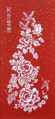前后构思近一个月,来回修改了两版设计稿,刻画裁剪花了一星期,最终成功制作出这幅半米多长的剪纸作品。庆少仪说,“第一版设计更有创意,用红纸和白纸染成金色叠加起来剪制,但效果不太好。作品经反复修改,保留了牡丹和仙鹤这两个元素,寓意祖国繁荣昌盛,不断向前发展。”