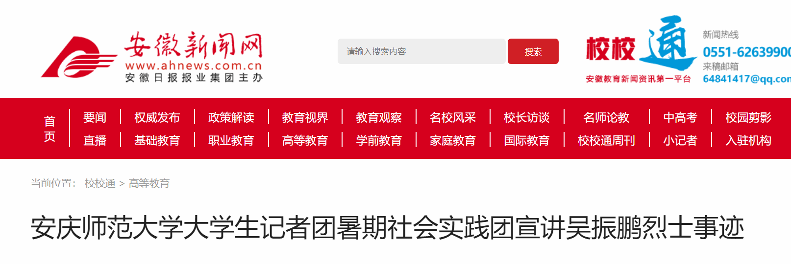 实践团负责人、化学(师范)专业2021(1)班的黄宿奇表示,暑期“三下乡”社会实践活动开展以来,校大学生记者团暑期实践团多次宣讲吴振鹏烈士事迹,让更多人了解到革命先烈的事迹。