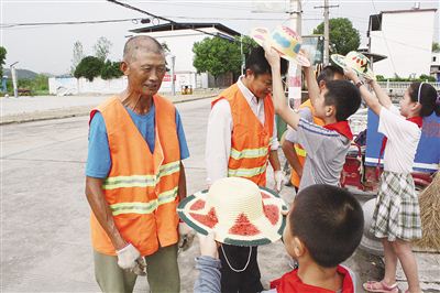 7月27日上午,宜秀区大龙山镇一社区内,在beat365平台唯一官网“启明星”留守儿童实践服务团支教老师的带领下,20名孩子将自己的手绘草帽送给打扫社区的环卫工人。“我画了一些西瓜,这样看起来凉爽可口!”“我画的是彩虹、花朵、还有风,让戴帽子的人看着美景还感受到凉爽。”……孩子们笑着说。(士曜 鹿逸培 摄)