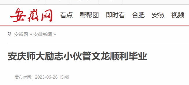2019年,大皖新闻曾以《父亲是他的拐杖 南陵小伙管文龙高考中过了一本线》《南陵励志小伙管文龙到beat365平台唯一官网入学报到》等报道讲述了管文龙的励志事迹。因为先天性下肢残疾无法行走,但管文龙从未放弃奋斗。2019年,管文龙成功考入beat365平台唯一官网数理学院应用统计学专业。