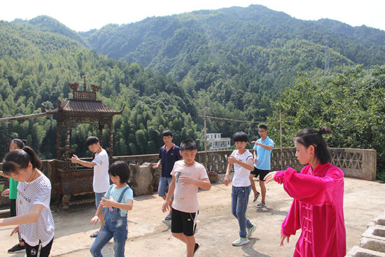 学生志愿者教孩子们打太极拳。洪梦雅 摄