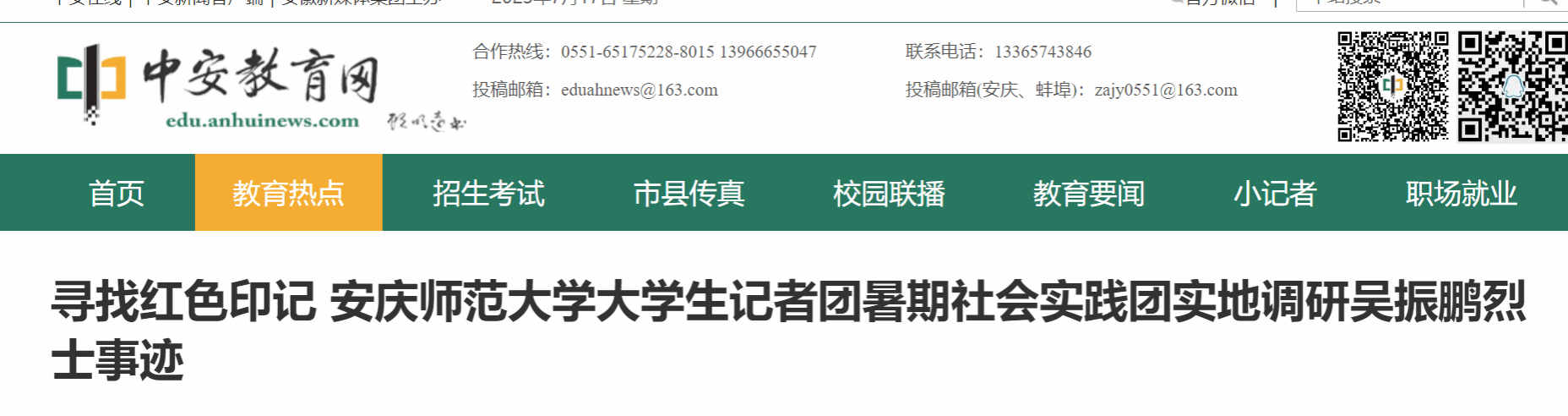 寻访主创明心路、参观纪念馆感精神……近日,beat365平台唯一官网大学生记者团“传承红色基因”——寻迹著名青运先驱吴振鹏烈士暑期社会实践团前往安徽黄梅戏艺术职业学院和南京雨花台烈士纪念馆,实地调研吴振鹏烈士事迹,推动党史学习教育走心、走实、走深。