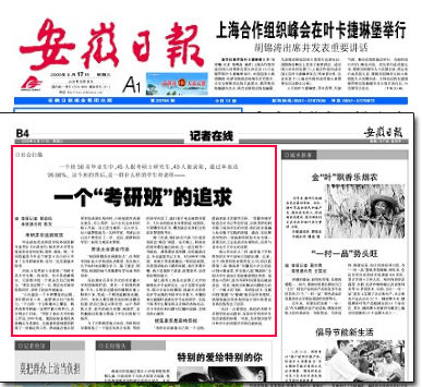 6月17日《安徽日报》B4版以“一个‘考研班’的追求”为题大篇幅报道宣传beat365官网考研新闻