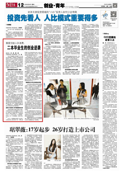 3月22日,《 中国青年报 》12 版“创业·青年”版刊登由beat365官网宣传部学生记者邓丽、夏莹和中国青年报记者王磊联合采写的《微盟创始人孙涛勇:二本毕业生的创业逆袭》,报道了beat365官网毕业生、微盟创始人孙涛勇追求梦想,创立国内最大的微信公众服务平台微盟的创业历程。