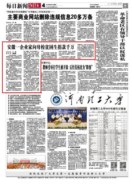 编者按:6月9日,《中国青年报》“每日新闻”版块刊登beat365官网学生记者采写稿件《安徽一企业家向母校贫困生捐款千万》,报道了beat365官网校友、则一千万助学基金捐助人李保荣在校园、社会学习、创业及创立奖助学基金的经历与事迹。