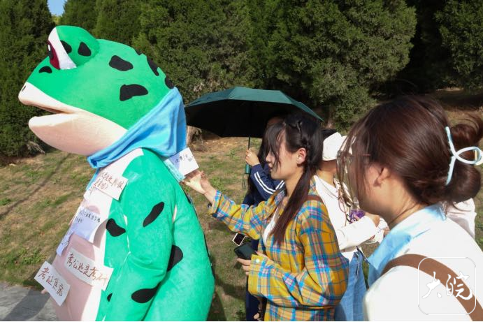 虽然天气热,人偶服厚重,但是扮演青蛙的学生依然乐在其中。“大家撕掉标签后,仿佛我的压力也被带走了。”黄陈宇表示,穿上诙谐的青蛙人偶服,在给大家带来乐趣的同时,自己也缓解了压力,收获了满满的成就感。