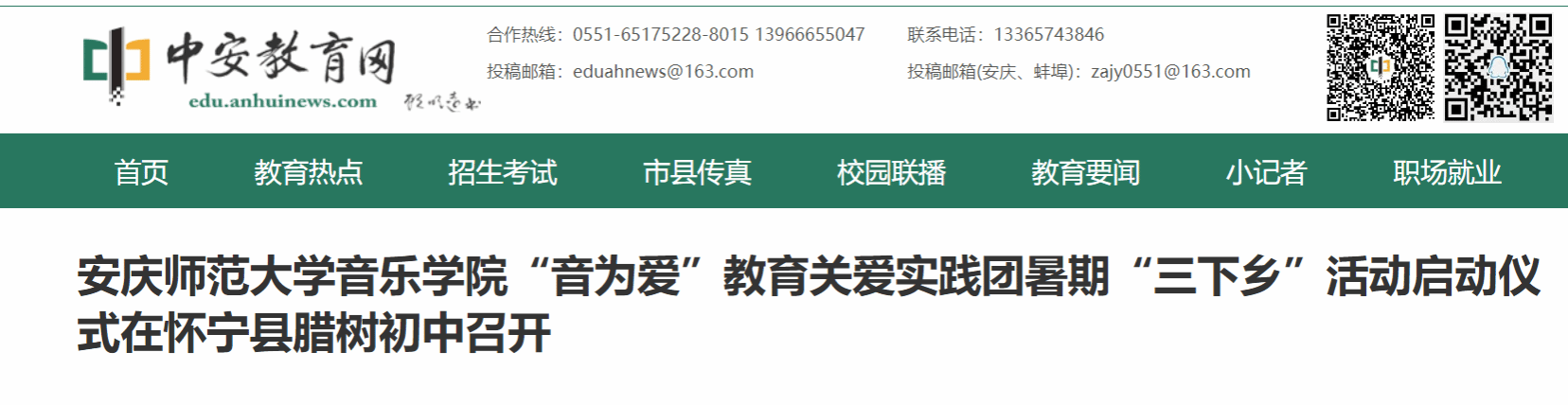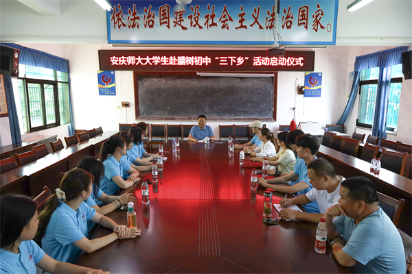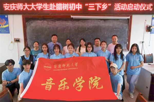 7月6日,beat365平台唯一官网音乐学院“音为爱”教育关爱暑期实践团“三下乡”实践活动启动仪式在怀宁县腊树初中召开,beat365平台唯一官网音乐学院团委副书记汪茗燕、指导教师卢星、腊树初中校长史志学及总务处主任陈贵丙、副主任陈志、校办室主任产九胜、留守儿童之家辅导教师姜玲玲出席仪式,实践团12名成员参加仪式。