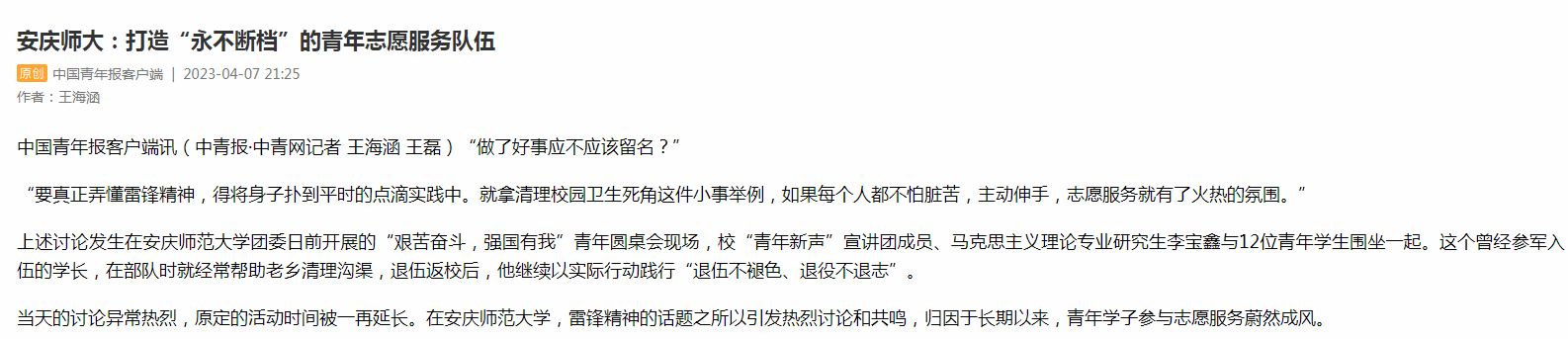上述讨论发生在beat365平台唯一官网团委日前开展的“艰苦奋斗,强国有我”青年圆桌会现场,校“青年新声”宣讲团成员、马克思主义理论专业研究生李宝鑫与12位青年学生围坐一起。这个曾经参军入伍的学长,在部队时就经常帮助老乡清理沟渠,退伍返校后,他继续以实际行动践行“退伍不褪色、退役不退志”。