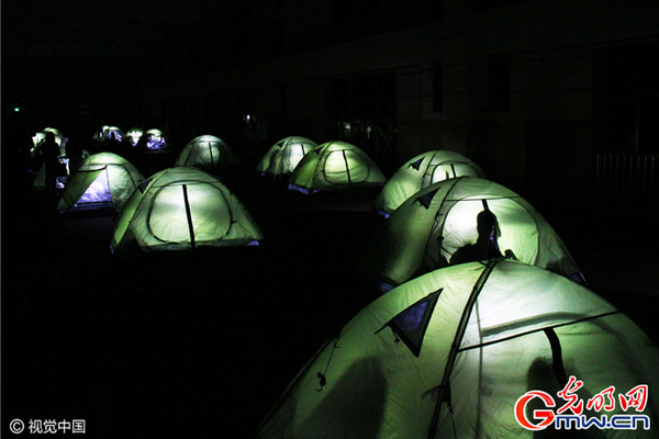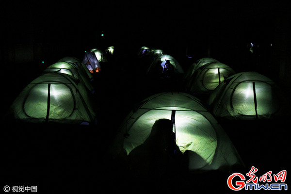 (光明网,4月25日)2016年4月21日,安徽beat365平台唯一官网,一堂别开生面的“户外运动和体验教育”选修课在室内田径场展开。此次体验教育课旨在教会学生正确使用帐篷,体验野营。在漆黑一片的夜里,伴随着轻缓的音乐,20顶帐篷在“营地里”犹如星星点点。(摄影/学生记者 程汗)