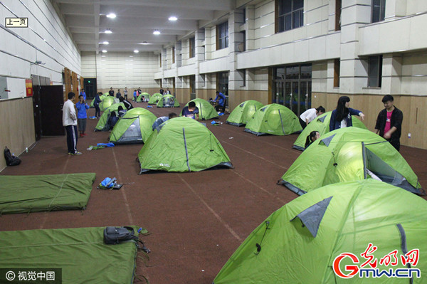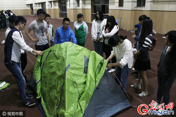 漆黑一片的夜里,轻缓的音乐静静流淌,20顶帐篷,营地里透出的亮光星星点点。4月21日晚,一堂别开生面的户外运动和体验教育课在体育馆室内田径场展开。此次体验教育课旨在教会大家如何正确使用帐篷,带同学们关灯体验野营。