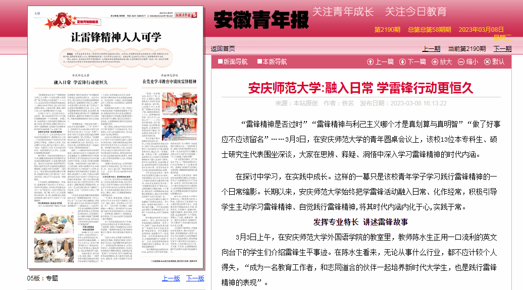 3月的校园,雷锋精神犹如一阵春风,轻拂着每个安庆师大学子的心。从同声传译教室、读书园,到创新创业大厅、“3C”服务大厅,处处可见师生宣讲的身影。据了解,当天上午,四名教师分别用中、英、俄、法四种语言讲述雷锋故事,数百名学生共同学习了雷锋精神。
