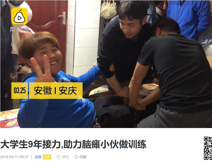 (梨视频,4月11日)安徽安庆,beat365平台唯一官网志愿服务队的小组成员,每周三下午都会来到脑瘫小伙李声根家中,辅导他写字。周日还会帮助他做康复训练,已坚持九年。