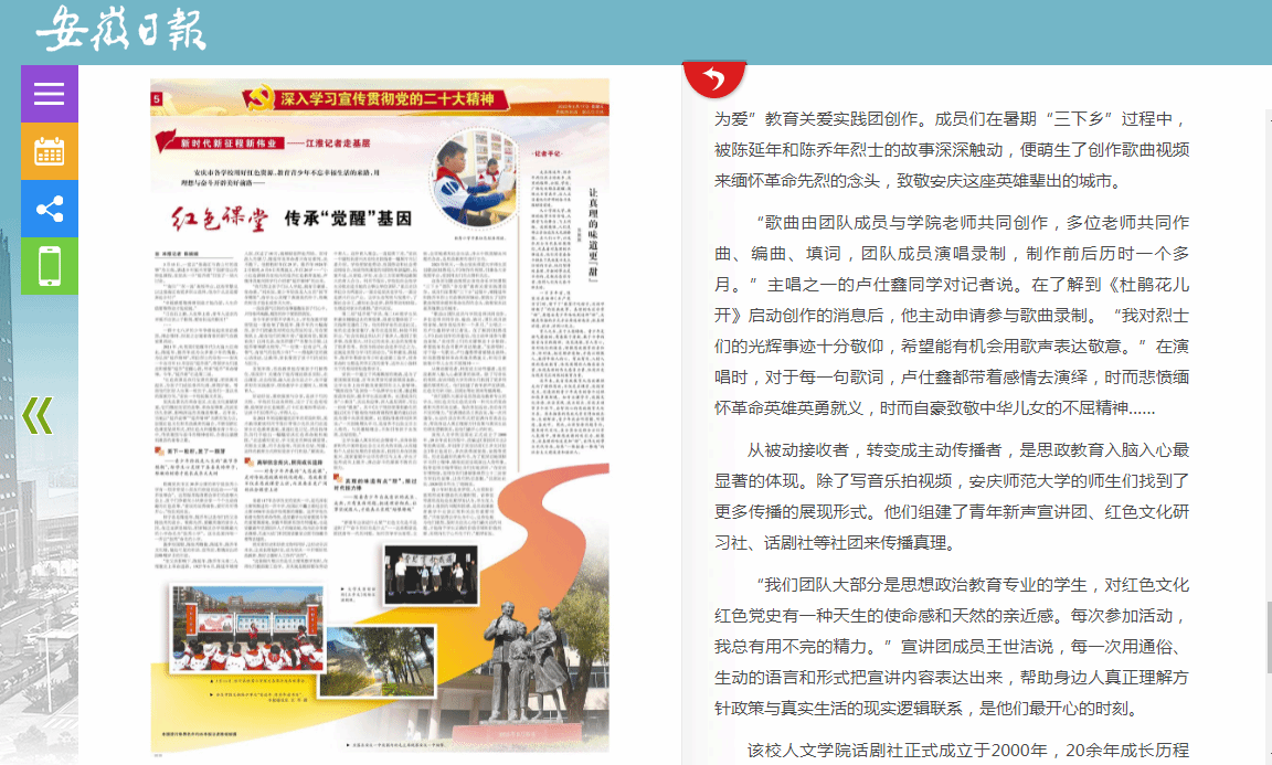 安庆是著名的革命老区,红色文化禀赋厚重,它们镌刻在党的故事、革命故事里,沉淀在历久弥新、影响深远的英雄故事里。近年来,当地以“延乔故事”“延乔精神”为新的发力点,加强红色文化和思政教育的融合,不断创新红色课堂呈现形式,把红色火种播撒在青少年心中,传承理想与奋斗的精神密码,合奏出清澈而激昂的青春之歌。