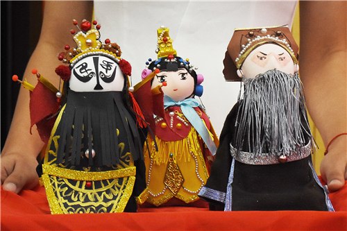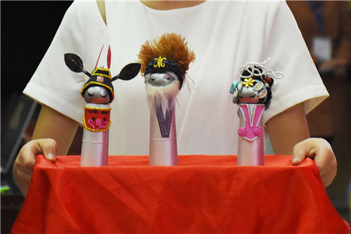 “力拔山兮气盖世。时不利兮骓不逝。骓不逝兮可奈何!虞兮虞兮奈若何!”由京剧《霸王别姬》带来灵感,8号组合的杨蕊和陈丹萍制作了京剧玩偶。他们参考京剧的服装和脸谱、汉代服饰和京剧戏服,将传统京剧与卡通结合,通过手工泥人、剪纸及彩绘的方式,制作出青脸的虞姬、黑白脸的霸王和素面的刘邦。