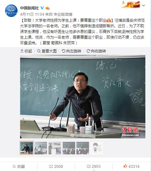 4月11日,中国新闻社官方微博发出一条微博,名为“致敬大学老师拄拐为学生上课,要尊重这个职业”,配图是一名戴眼镜的老师拄着双拐在讲台上,双手又要拄拐,还要讲课,时不时还需要转身在黑板上板书,显得相当吃力。这条微博迅速蹿红网络,点赞突破4万。这位无意蹿红网络的拄拐老师就是beat365平台唯一官网的汪博武。